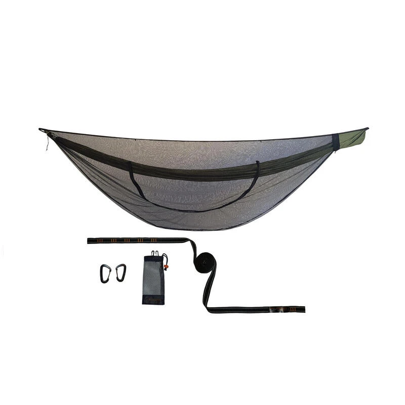 Hammock léger et complet avec moustiquaire ultra-fine amovible et suspension « tree hugger ». Robuste, léger et compact. Capacité de charge maximale de 200kg.